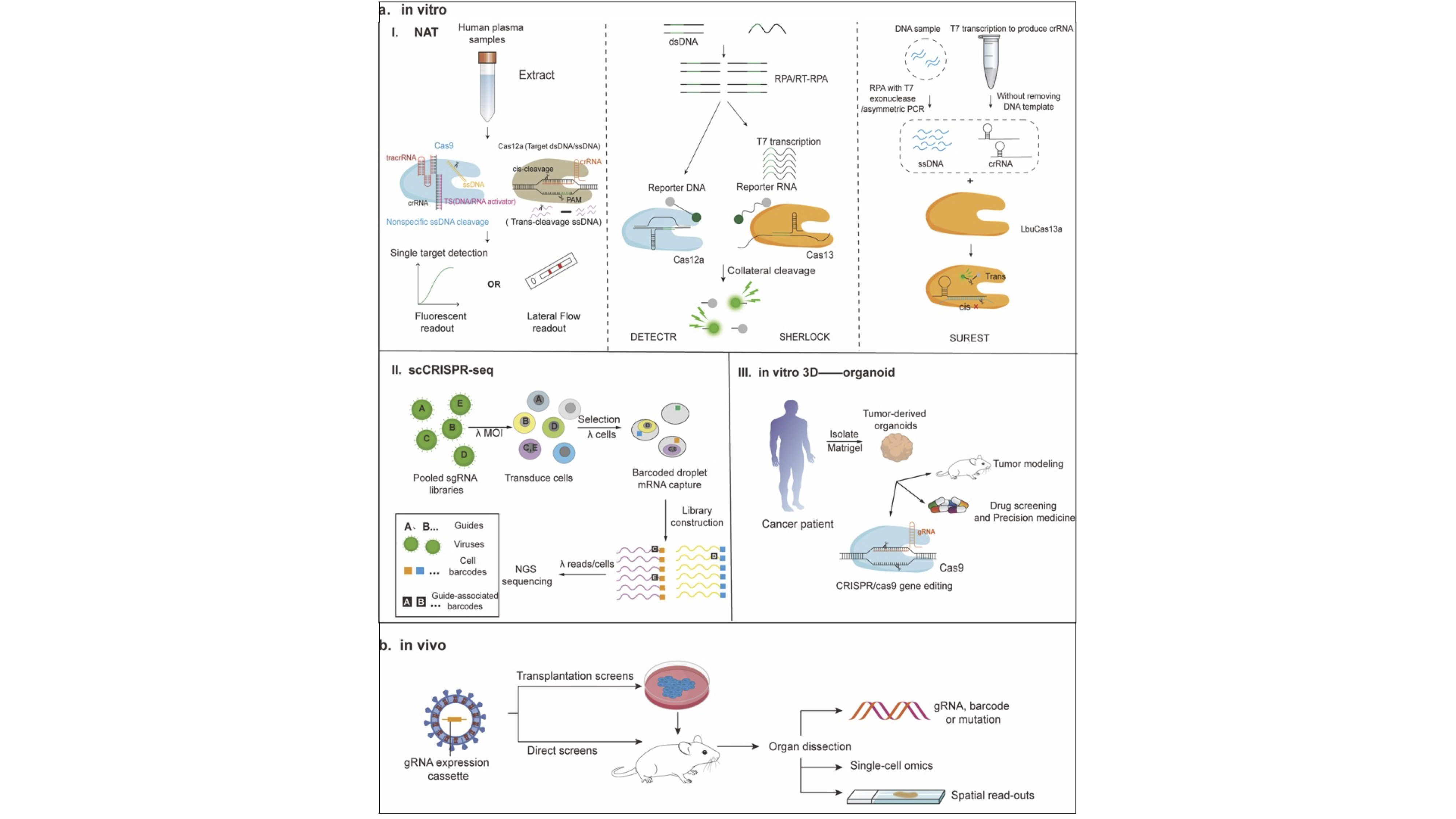 Figure 3. CRISPR-enabled platforms for molecular diagnostics and functional genomics. (I) Nucleic acid detection: The trans-cleavage activity of Cas9 is activated upon binding to DNA or RNA targets. Cas12a allows for cis-cleavage and trans-cleavage. Subsequently, fluorescence detection or lateral flow readout is performed. DNA or RNA is amplified through RPA or RT-RPA, respectively. The amplified RPA products are converted into RNA through T7 transcription. When crRNA binds to its complementary target sequence, it activates the Cas enzyme, triggering collateral cleavage that quenches the fluorescent reporter. Thus, Cas13a (for the SHERLOCK system) or Cas12a (for the DETECTR system) indicates the presence of RNA or DNA target sequences, respectively. For Cas12 detection, the T7 transcription step is omitted, allowing direct detection of the amplified target. The fundamental principle of the SUREST platform is that the LbuCas13a-crRNA-ssDNA ternary complex exhibits significant trans-cleavage activity when targeted to DNA. (II) Perturb-Seq: By constructing the pooled sgRNA library and infecting cells with a pool of viral vectors encoding sgRNA, each cell’s mRNA (including GBC) is labeled with a unique cell barcode (CBC) and unique molecular identifier (UMI) for scRNA-seq. (III) Organoid technology can be used to model various human cancers, test drug efficacy and toxicity in precision medicine, and develop novel targeted therapies. In addition, synergistic use of CRISPR-Cas9 gene editing can elucidate the pathophysiology of various cancers and investigate the effects of specific genetic changes on tissue function and disease progression. (b) In vivo CRISPR screening is divided into transplant screening and other types of in vivo screening. In transplantation screening, cells are transduced in vitro and then transplanted into adult animals. In direct screening, the gRNA library is delivered directly to the target tissue or cell type in the mouse. Subsequently, screening readouts are performed, with phenotypes measured as changes in gRNA or barcode abundance or frequency, or using single-cellomics or imaging techniques to record multidimensional phenotypes for each perturbation. Fig. 3a was adapted from Ref 89, licensed under CC-BY-NC-ND 4.0 (http://creativecommons.org/licenses/by-nc-nd/4.0/), Fig. 3b was created using graphical components from Servier Medical Art (https://smart.servier.com/), licensed under Creative Commons Attribution 4.0 (CC BY 4.0).